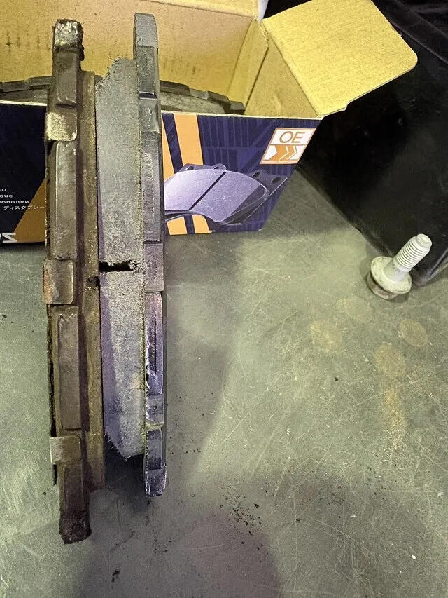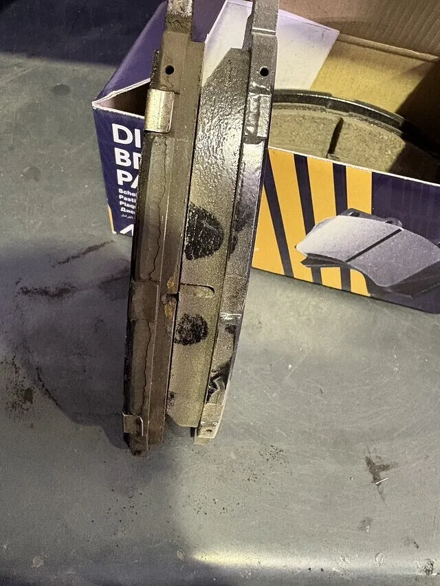 作業台の上に並べられたブレーキパッド、その隣には新品の箱がそっと置かれています。